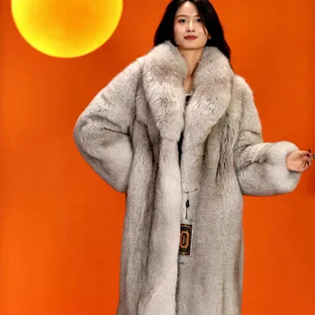 • Women's Long Winter Coat with V Neck Wholesale Windproof and Warm Grey Fox Fur Elegant Style Mink Coat