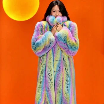 • Wholesale Colorful Long Fox Fur Coat Women Winter Warm and Soft Dyed Muli-color fox Fur Coat with Stand Collar Mink Coat