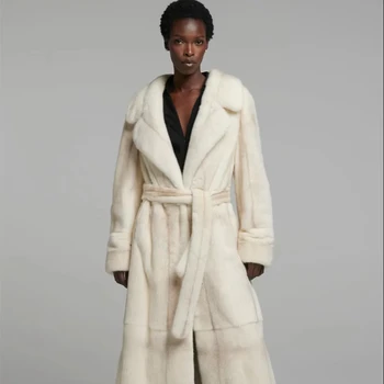 • Cream White Plus Size Mink Coats for Sale English Collar Classic Natural White Mink Coat with Belt and Pockets Elegant Fashion
